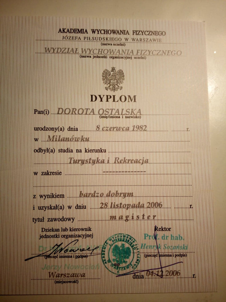 Zamiłowanie do aktywności ruchowej posiada od najmłodszych lat. Jako instruktorka fitness pracuje od 2004 roku. Dorota jest także instruktorem Snowboardu oraz Nordic Walking.