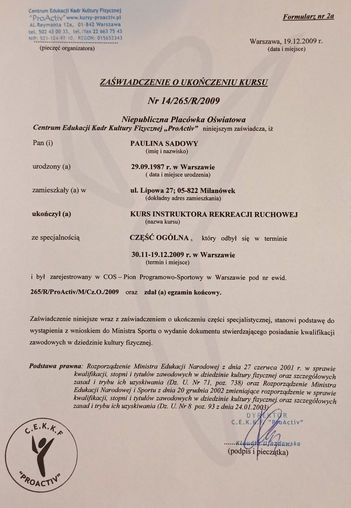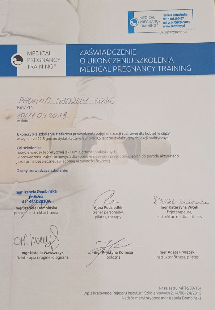 Jako położna, pedagog, instruktorka fitness, a także trenerka personalna interesuje się treningiem oraz fizjologią kobiet powracających do formy po okresie ciąży. Specjalizuje się także w treningu z małymi pociechami i ich rodziców.